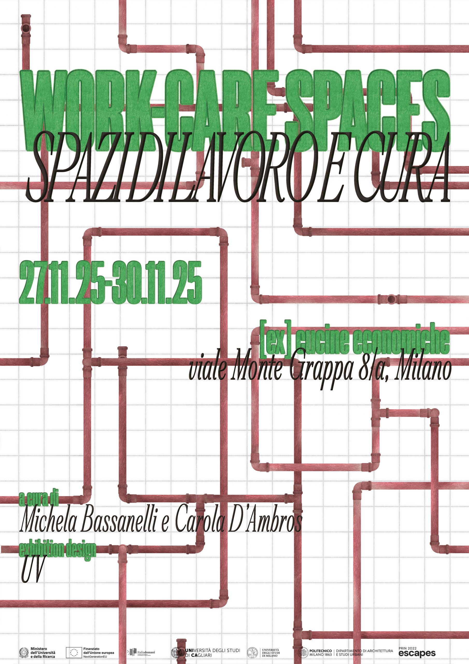Suddivisa in cinque sezioni tematiche, analizza, nelle prime due, gli “spazi di lavoro non convenzionali” ovvero luoghi situati esternamente all’ufficio e alla casa in grado di adattarsi a bisogni individuali e collettivi, favorendo modelli di lavoro dinamici e relazionali, in rapporto con il contesto in cui si collocano. La non convenzionalità è inoltre legata alla presenza di servizi che comprendono non solo l’attività lavorativa, ma sono dotati di alcuni “plus” che riguardano la sfera della cura e del benessere. L’obiettivo è di restituire uno scenario che racconti le diverse forme di integrazione tra lavoro produttivo e riproduttivo a partire dall’analisi di due tipologie spaziali: i “coworking plus” – spazi di lavoro condiviso che integrano servizi di cura (sezione 1) – e i “collective home working plus” – abitazioni collettive che, oltre a offrire una vasta gamma di servizi condivisi, dedicano uno degli spazi comuni al lavoro (sezione 2). Questo primo lavoro di indagine e mappatura ha definito le basi per l’organizzazione del workshop Carespaces, tenutosi nel febbraio 2025 e condotto dal Politecnico di Milano (Scuola AUIC e Scuola del Design) e dall’Università degli Studi di Cagliari, in cui studenti di architettura e di design hanno esplorato la riconversione dei piani terra di due edifici esistenti, a Milano e a Cagliari, per progettare i Work-Care Spaces, infrastrutture architettoniche e sociali che integrano lavoro e pratiche di cura (sezione 3). Le ultime due sezioni presentano alcuni affondi specifici: la prima raccoglie alcune voci di lavoratori e lavoratrici che l’Unità di ricerca di sociologia della famiglia (UNICA) ha raccolto nel corso della sua indagine qualitativa e, la seconda, racconta la storia del luogo che ospita la mostra. L’edificio delle Ex-Cucine Economiche progettato dall’architetto Luigi Broggi nel 1883 era, infatti, la sede dell’“Opera Pia Cucine Economiche”, che distribuiva pasti caldi alle persone bisognose. Oggi di proprietà del Comune di Milano ospita la Casa di Quartiere Montegrappa (Municipio 9).